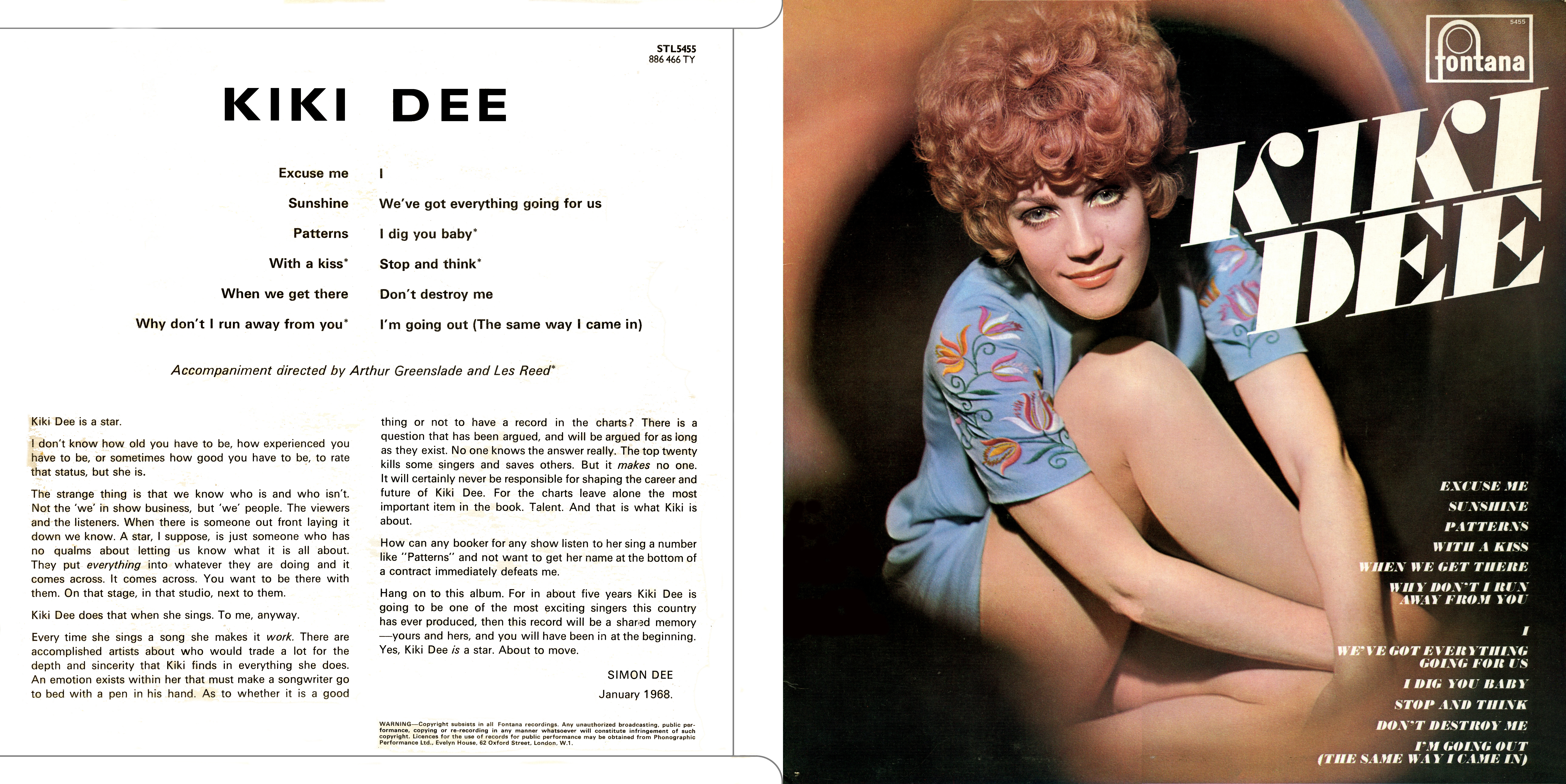 Kiki Dee - one of the biggest talents we've heard in a long while! This live-wire redhead from Bradford started singing professionally with local dance-bands; suddenly she was spotted by someone "in the know" while appearing at a ballroom in Leeds. Word quickly got through to Fontana's A and R manager Jack Baverstock in London. A test was arranged, and while Jack was listening Mitch Murray walked in, liked what he heard, and returned a few days later with a song composed especially for her - Early Night.